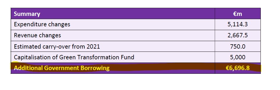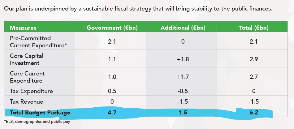 The Social Democrats plan to borrow €6.696bn. Again, very easy to see. (Although I think they may have over-estimated as the “carry-over” I’m taking to be net fiscal space and that should be €1.5bn which would give them a net borrowing figure of €5.946bn – €5bn for their Green Fund and €946m to fund the shortfall in additional core expenditure. But I digress.)