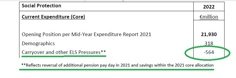 It appears that the way the government squared this circle is with a line item in the Social Protection budget, where they say they have a saving of €564m in ELS pressures related to pensions: