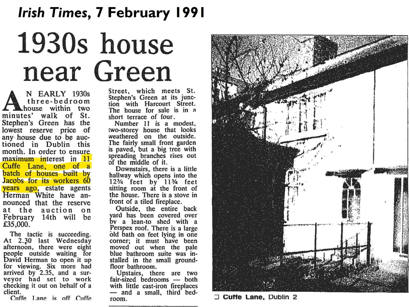 ‘In addition to the houses already erected thirteen more cottages would soon be erected in Cuffe Lane as a result of the kind assistance given by Messrs Jacob and the helpful attitude of the Commissioners in the way of sites. The Corporation was willing to give sites elsewhere also.’