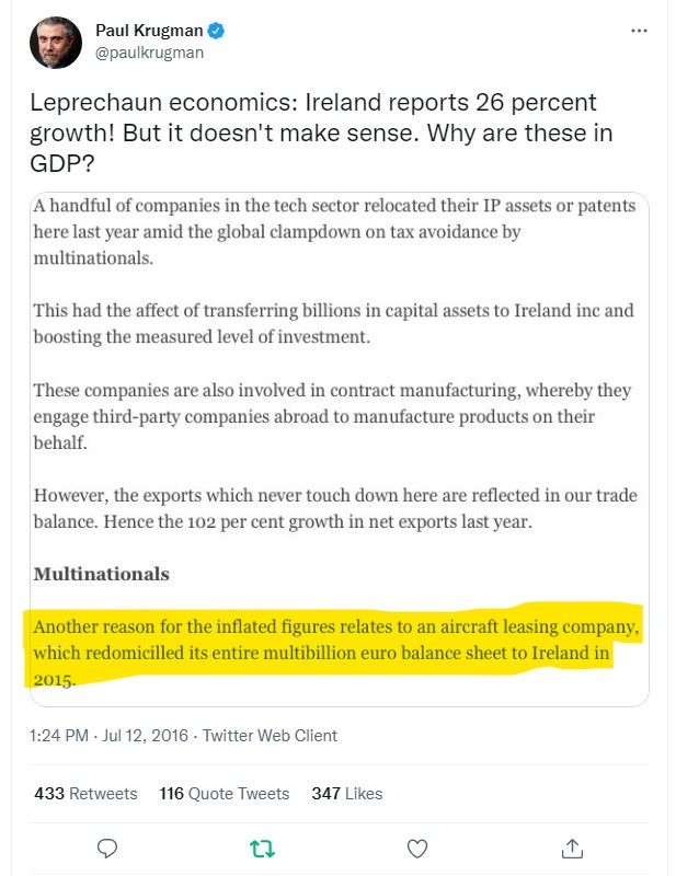 Aside from being topical, the building also serves to highlight one of the more ‘interesting’ aspects of Ireland’s GDP – the part that Paul Krugman labelled ‘leprechaun economics’ in a tweet on 12 July 2016.