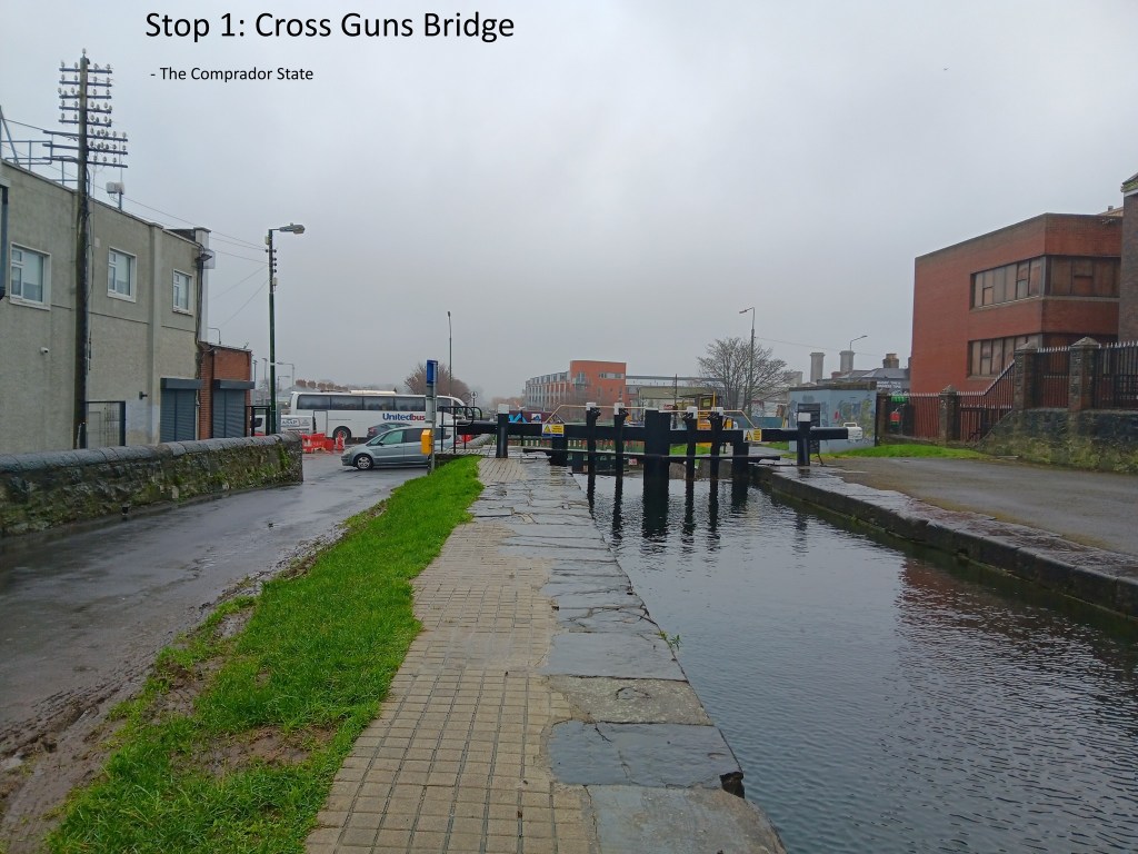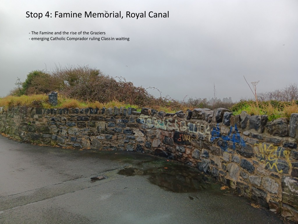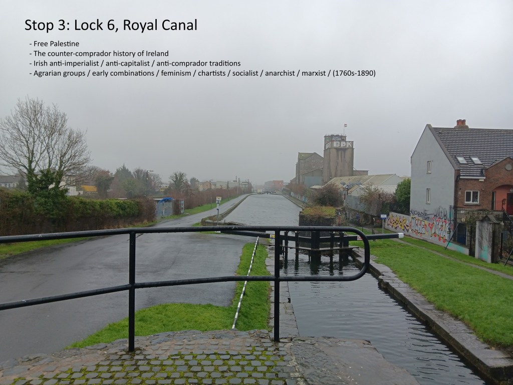I designed recently a radical walk for Daylight Glasnevin, a new social space on the northside of the city. The route was along the Royal Canal. Its main focus was the dynamic of class relations in the Irish state, and it covered topics such as social housing speculation from the 1880s to today; the rise of the comprador class; trade unions in the Free State; agrarian secret societies; and feminist, Chartist, socialist and Marxist writings from the 1780s onwards.