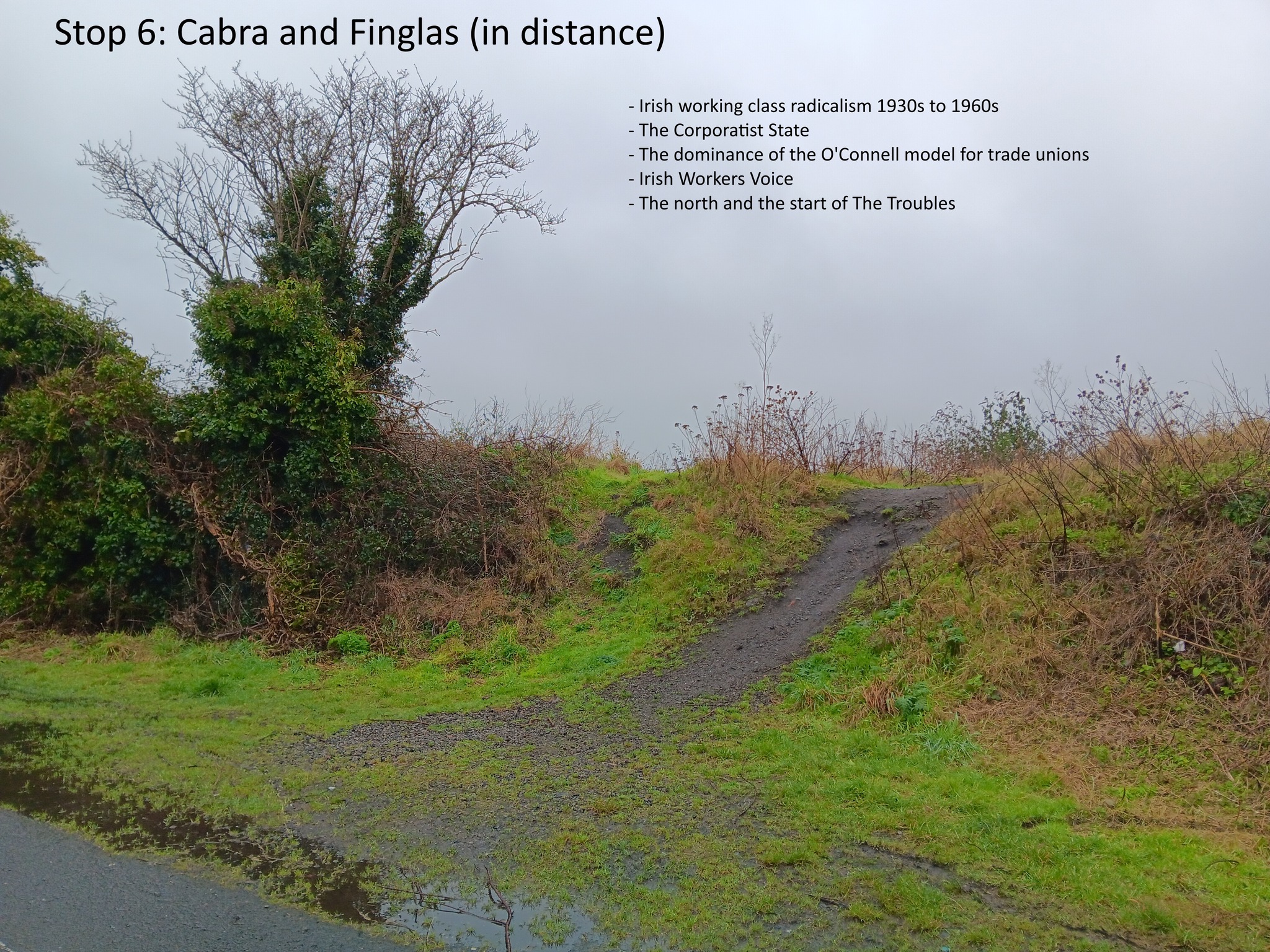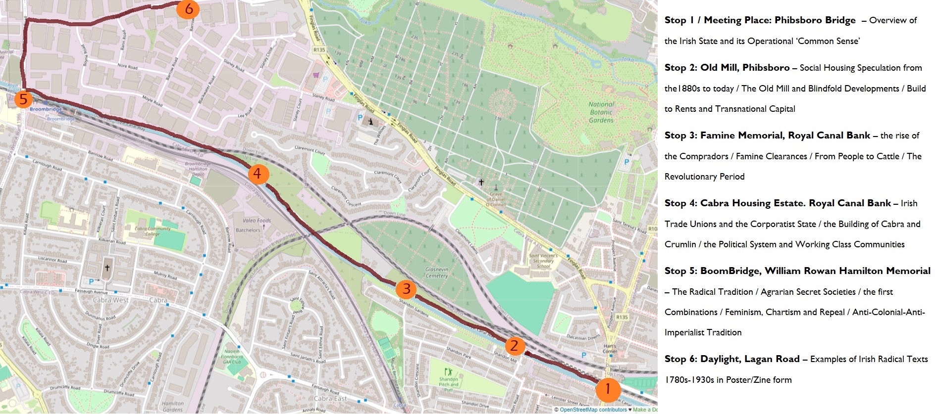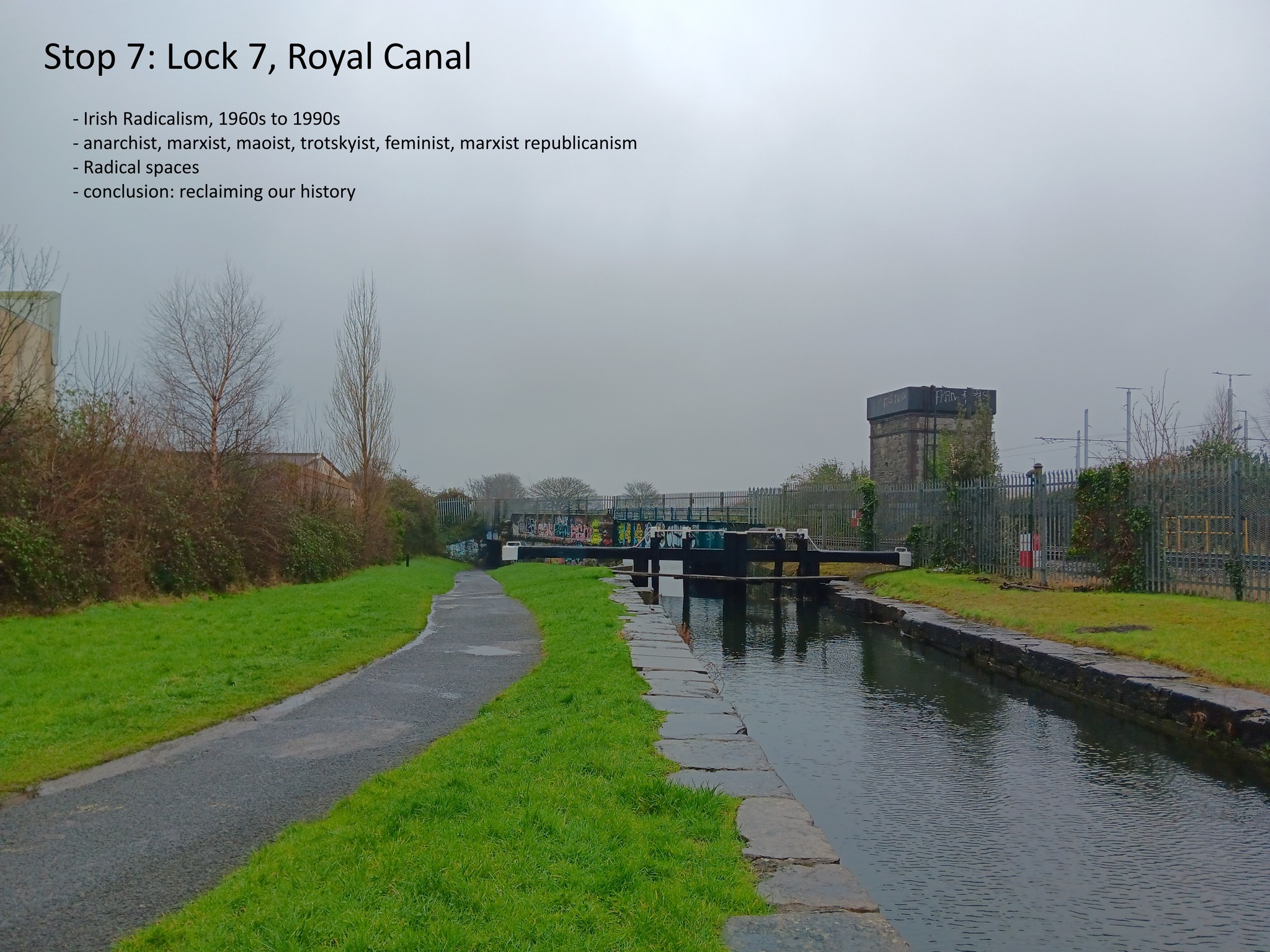 I designed recently a radical walk for Daylight Glasnevin, a new social space on the northside of the city. The route was along the Royal Canal. Its main focus was the dynamic of class relations in the Irish state, and it covered topics such as social housing speculation from the 1880s to today; the rise of the comprador class; trade unions in the Free State; agrarian secret societies; and feminist, Chartist, socialist and Marxist writings from the 1780s onwards.